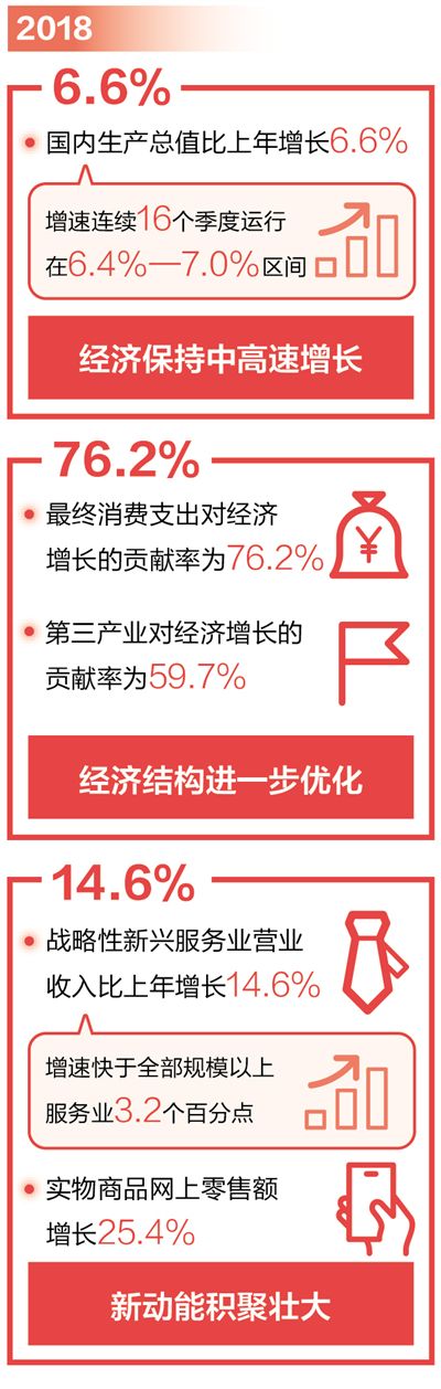 2018年,我國(guó)經(jīng)濟(jì)總量站上90萬(wàn)億元的歷史新臺(tái)階,這是自2016年突破70萬(wàn)億元,2017年突破80萬(wàn)億元后,中國(guó)經(jīng)濟(jì)再次站上新臺(tái)階。經(jīng)濟(jì)運(yùn)行實(shí)現(xiàn)總體平穩(wěn)、穩(wěn)中有進(jìn),供給側(cè)結(jié)構(gòu)性改革深入推進(jìn)、經(jīng)濟(jì)結(jié)構(gòu)進(jìn)一步優(yōu)化,創(chuàng)新驅(qū)動(dòng)加快實(shí)施、新動(dòng)能成長(zhǎng)蹄疾步穩(wěn)。