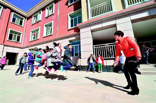 圖為:堯治河村小,孩子們在歡快地跳長繩。(資料圖片)