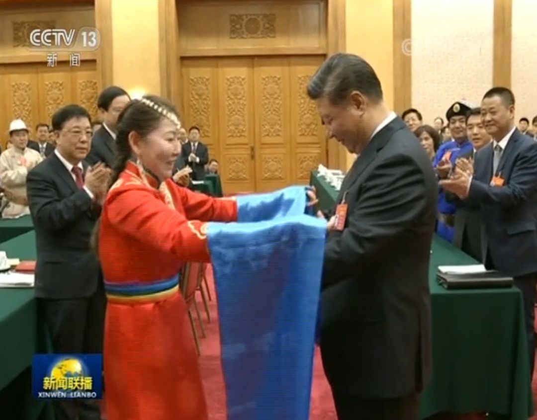 當習近平走進會場時,全場起立熱烈鼓掌。鄂溫克族代表向習近平獻上藍色的哈達,表達內蒙古各族群眾對黨中央和總書記的敬意。習近平向他們表示感謝,并請他們轉達對各族干部群眾的誠摯問候。