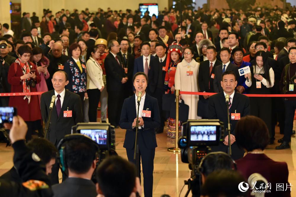 3月5日上午8:05,十三屆全國人民代表大會第二次會議在人民大會堂舉行首場“代表通道”。在首場“代表通道”中,8位全國人大代表接受了記者采訪。(人民網記者 翁奇羽 攝)