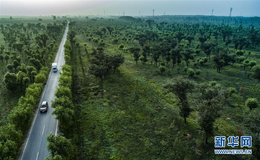 汽車行駛在陜西榆林市靖邊縣東坑鎮新建村的道路上(2018年8月1日無人機拍攝)。陜西省開展的天然林保護工程和全面治理荒沙行動,極大改善了毛烏素的生態環境,也使沙漠南緣的陜西省榆林市實現從“沙進人退”到“綠進沙退”的轉變。 新華社記者 陶明 攝