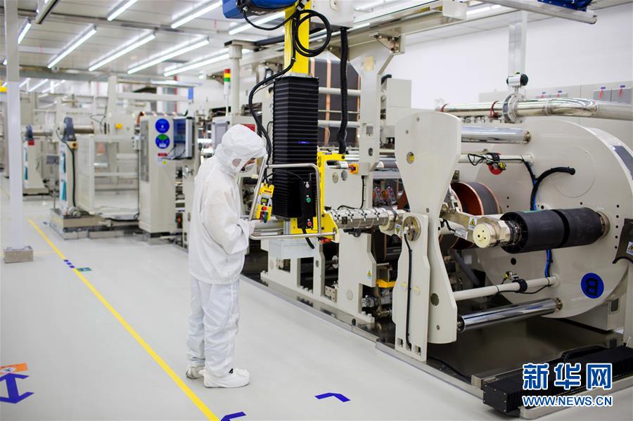 在福建省寧德市蕉城區漳灣鎮,寧德時代新能源科技股份有限公司產線工人在潔凈自動化電芯生產車間工作(資料照片)。新華社發
