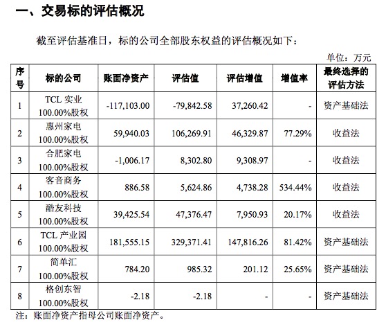 TCL產業園主營業務是開發、運營TCL集團智能終端業務的廠房、辦公物業等。2018年6月30日本次交易選取資產基礎法對TCL產業園進行評估,其(母公司口徑)凈資產賬面價值18.16億元,評估值32.94億元?!俺敬谓灰淄?,TCL產業園最近三年未進行資產評估。”