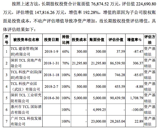 增值主要來自于對房地產公司的長期股權投資,其中TCL產業園持股70%的深圳TCL房地產有限公司的投資成本為2.13億元,評估值8.65億元;TCL產業園持股100%的深圳TCL工業研究院有限公司投資成本5000萬元,評估價值為9.04億元。