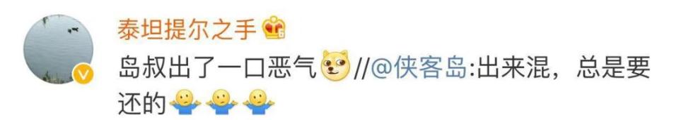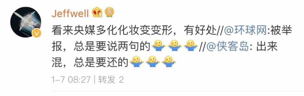 8時許,人民日報海外版旗下微博賬號@俠客島 轉(zhuǎn)發(fā)了新京報微博發(fā)布的相關(guān)報道并評論:出來混,總是要還的。