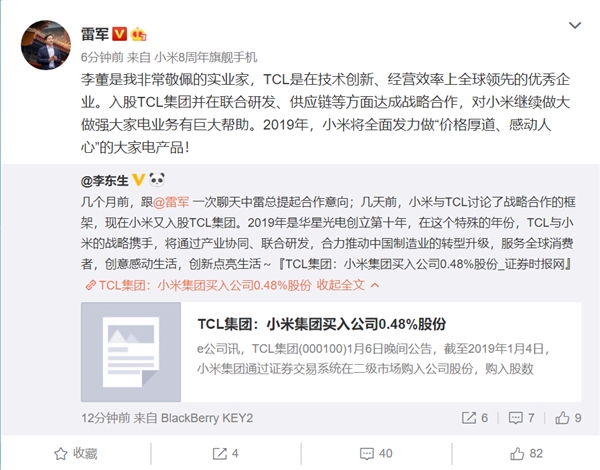 TCL集團股份有限公司董事長兼CEO李東生表示,幾個月前在一次聊天中雷總提起合作意向;幾天前小米與TCL討論了戰略合作的框架,現在小米又入股TCL集團。