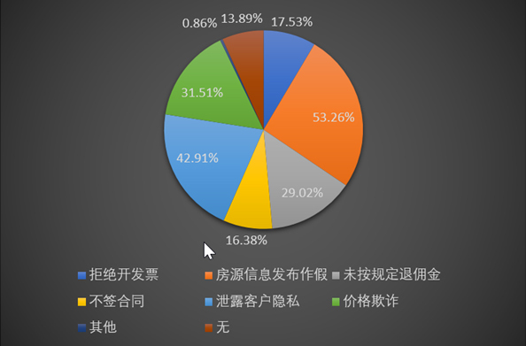 在表示“不滿意”的受訪者中,53.26%消費者在接觸互聯網房產交易服務平臺中遇到了房源信息作假,42.91%的受訪者在接觸互聯網房產交易服務平臺中泄露客戶隱私,此外,受訪者遭遇的問題還包括了未按規定退還傭金、遭遇價格欺詐、不簽合同、拒絕開發票等。