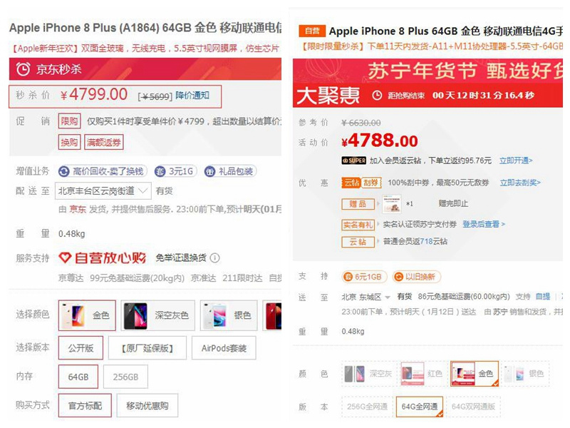 圖片左邊為京東iPhone 8P售價,右側為蘇寧iPhone 8P售價。