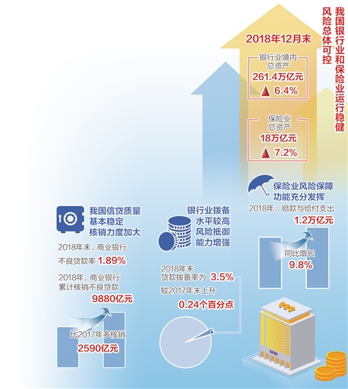 劉志清表示,當前我國銀行業和保險業運行穩健,風險總體可控。銀行業規模持續增長,貸款占比穩步上升。據初步統計,2018年12月末,銀行業境內總資產261.4萬億元,同比增長6.4%。其中,各項貸款140.6萬億元,同比增長12.6%,債券投資45.2萬億元,同比增長14.1%。貸款和債券投資占總資產的比重分別較上年末上升3個和1.2個百分點。2018年前11個月,人民幣貸款增量占社會融資規模增量的83.4%,為實體經濟提供較多資金。銀行業境內總負債239.9萬億元,同比增長6%。其中,各項存款164.2萬億元,同比增長6.7%。