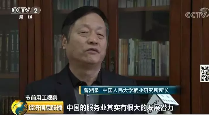 中國人民大學就業研究所所長曾湘泉:中國的服務業其實有很大的發展潛力,需要我們去提供專業化的培訓,培養全社會的專業化意識和職業化意識。