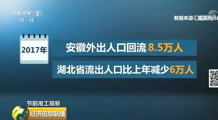 2017年,安徽外出人口回流8.5萬人;湖北省流出人口比上年減少6萬人。