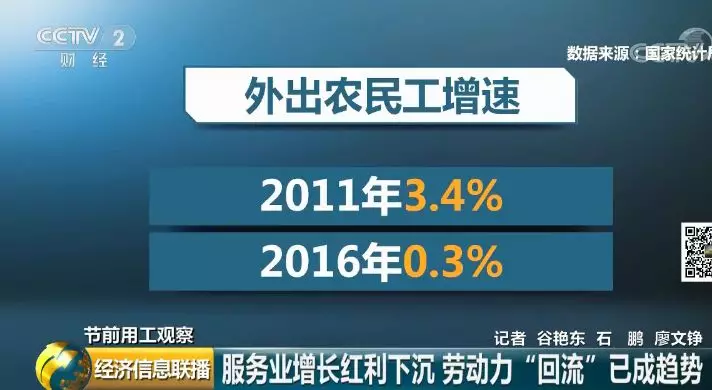 事實上,勞動力“回流”已成趨勢。國家統計局數據顯示,外出農民工增速從2011年的3.4%,已經回落到2016年的0.3%。