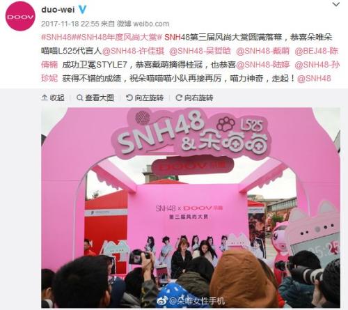 資料圖:朵唯手機(jī)代言人已經(jīng)換成SNH48小分隊(duì)。截圖自朵唯官方微博。
