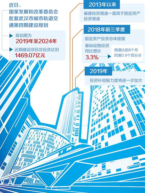 近日,國家發展和改革委員會批復武漢市城市軌道交通第四期建設規劃,規劃期為2019年至2024年,近期建設項目總投資達到1469.07億元。此外,2018年四季度,國家發展改革委已經陸續批復一系列基礎設施投資項目,涉及城市軌道、鐵路、機場工程等領域。經濟日報·中國經濟網記者梳理發現,這些基礎設施建設項目總投資規模逾1.2萬億元。