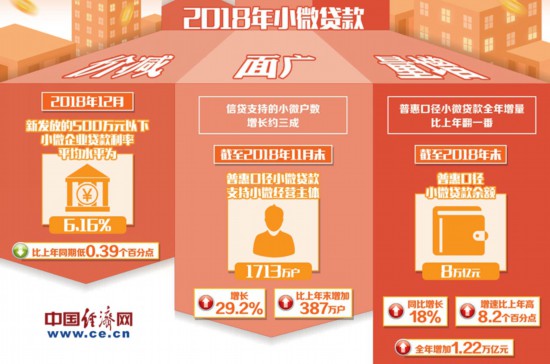 央行公布的數據顯示,2018年小微貸款呈現量增、面廣、價減的特點。從量上看,普惠口徑小微貸款全年增量比上年翻一番。截至2018年末,普惠口徑小微貸款余額8萬億元,同比增長18%,增速比上年高8.2個百分點。全年增加1.22萬億元,增量是上年全年的2倍。