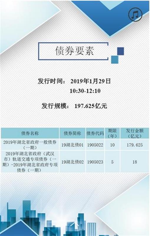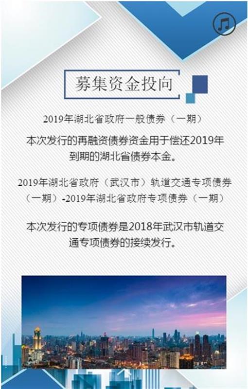 據了解,2019年湖北省政府一般債券(一期)發行規模為179.625億元,主要用于償還2019年到期的湖北省債券本金。2019年湖北省政府(武漢市)軌道交通專項債券(一期)-2019年湖北省政府專項債券(一期),發行規模為18億元,是2018年武漢市軌道交通專項債券的接續發行。這批債券的分銷日為2019年1月30日,債權登記日為1月31日,上市流通日為2月1日。