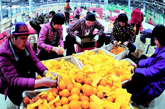 1月25日,宜昌市夷陵區電商產業園員工對橙子進行打包裝箱。春節臨近,夷陵區通過微店、微商等新的電商營銷方式,每天將上萬件宜昌橙子發送到全國各地。(視界網張國榮攝)