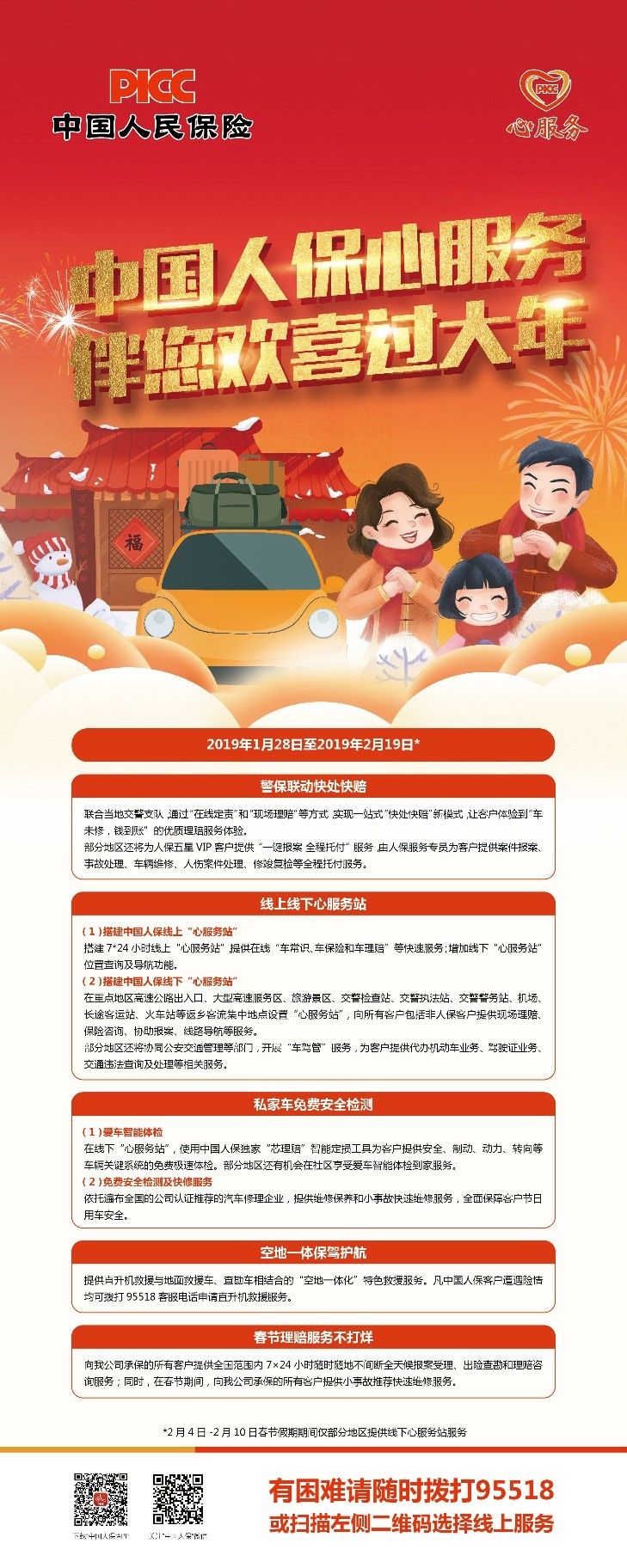 此次活動(dòng)時(shí)間為2019年1月28日至2019年2月19日,服務(wù)對(duì)象為全體人保客戶、社會(huì)各界朋友。重點(diǎn)推出“警保聯(lián)動(dòng)快處快賠、線上線下心服務(wù)站、私家車安全檢測(cè)、空地一體保駕護(hù)航、春節(jié)理賠服務(wù)不打烊”五項(xiàng)服務(wù)。