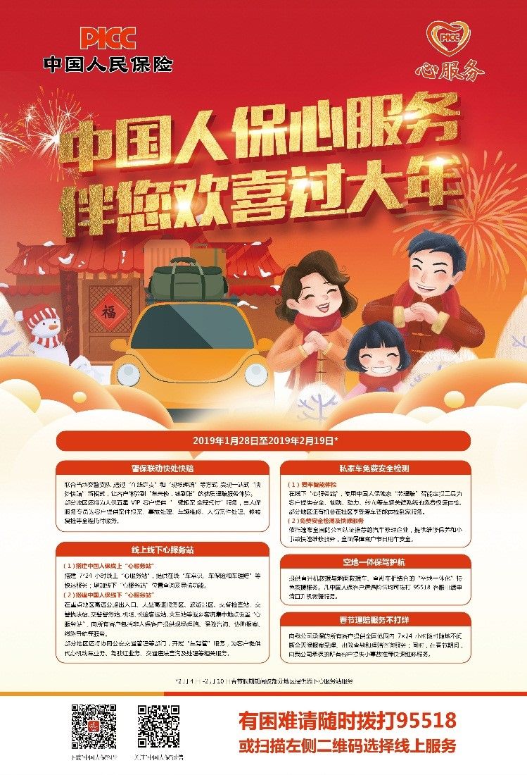 荊楚網(wǎng)客戶端—荊楚網(wǎng)消息(通訊員 蔣靜雯)春節(jié)是中國人民最隆重的傳統(tǒng)佳節(jié),是闔家團(tuán)圓、親朋好友歡聚的日子。2019春節(jié)期間,人保財(cái)險(xiǎn)湖北省分公司(以下簡稱“湖北人保財(cái)險(xiǎn)”)依托遍布全省的機(jī)構(gòu)網(wǎng)點(diǎn)、持續(xù)升級(jí)優(yōu)化理賠服務(wù),推出“中國人保心服務(wù)、伴您歡喜過大年”活動(dòng),旨在為廣大客戶回家過年、春節(jié)出行提供更好的服務(wù)保障,營造“團(tuán)聚、歡慶、祥和、奮進(jìn)、幸福”的喜慶氣氛,以實(shí)際行動(dòng)踐行“人民保險(xiǎn)、服務(wù)人民”企業(yè)使命和服務(wù)宗旨。