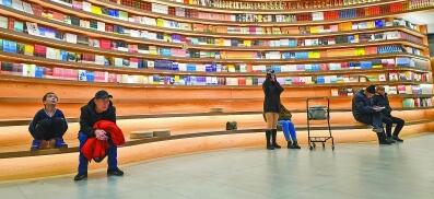 市民在內(nèi)蒙古呼和浩特市青城·閱立方圖書閱讀廣場(chǎng)的環(huán)形書墻中休憩、閱讀。新華社發(fā)