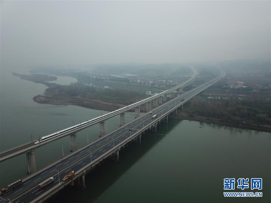 2018年12月25日,D9551次首發列車駛過富春江特大橋(無人機拍攝)。 新華社記者 邢廣利 攝