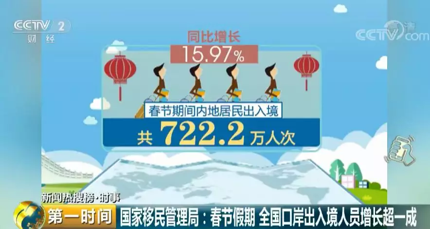 春節期間內地居民因私出入境增長最為明顯,共722.2萬人次,同比增長15.97%。