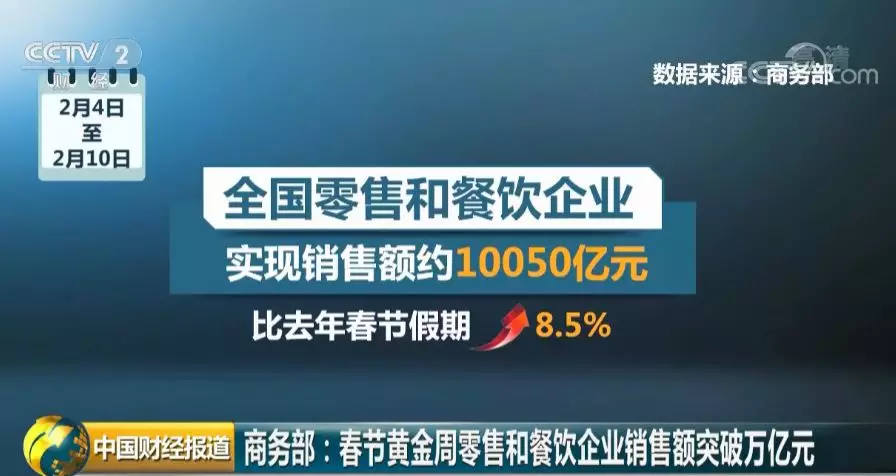 據商務部監測,除夕至正月初六,全國零售和餐飲企業實現銷售額約10050億元,比去年春節假期增長8.5%。