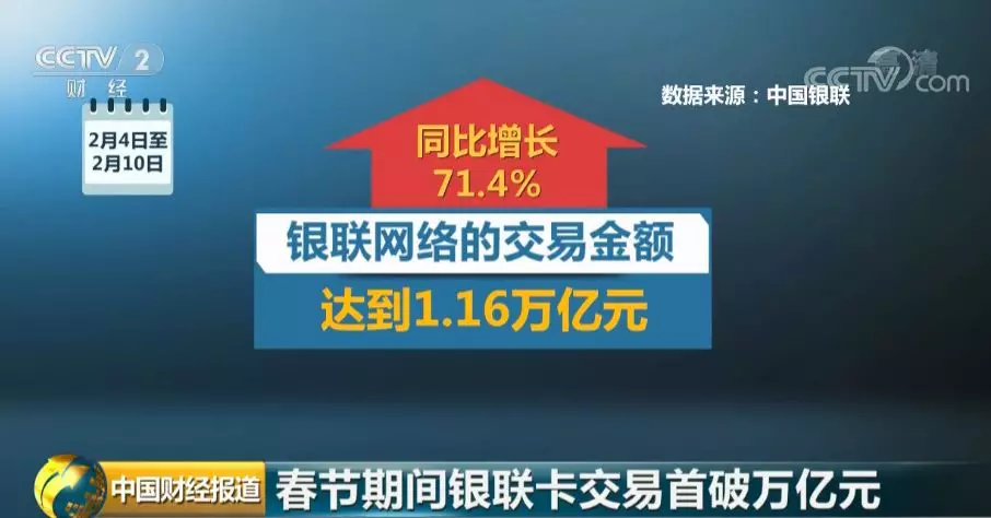 中國銀聯的統計顯示,從除夕到正月初六7天假期,銀聯網絡的交易金額已達到1.16萬億元,相比去年同期增長了71.4%。