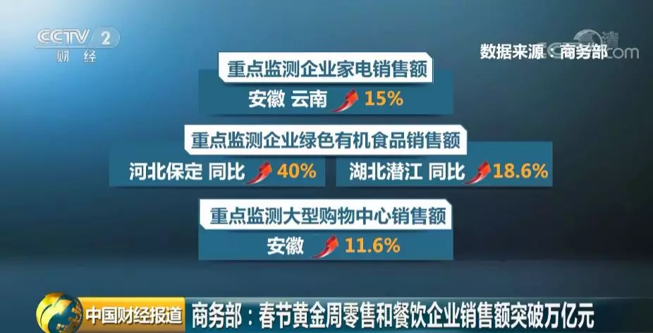 安徽、云南重點監測企業家電銷售額增長15%左右。河北保定、湖北潛江重點監測企業綠色有機食品銷售額同比分別增長40%和18.6%。安徽重點監測大型購物中心銷售額增長11.6%。