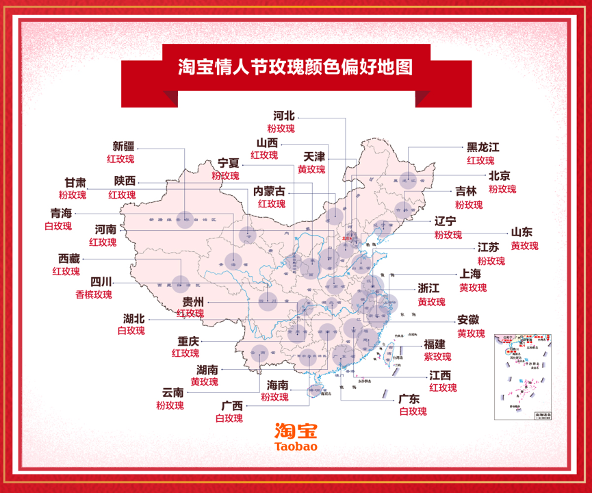 淘寶數(shù)據(jù)分析,江浙沿海一帶的消費(fèi)者最喜歡購買粉色、明黃色玫瑰作為情人節(jié)選擇,而中部西部城市消費(fèi)者則更加偏愛傳統(tǒng)紅色玫瑰,紫色玫瑰亦在偏好之類。盡管紅色玫瑰仍然挑情人節(jié)大梁,但相比去年,紅色玫瑰的銷量已經(jīng)下滑近5%,粉色、紫色、白色、香檳色開始冒頭,增幅均超過1倍。其中,以花語為“朋友之間的安慰玫瑰”的黃色玫瑰在沿海地帶也廣受歡迎。