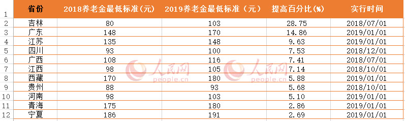 2019年1月初,廣東、江蘇、西藏、河南、青海和寧夏6省份也上調(diào)城鄉(xiāng)居民基礎(chǔ)養(yǎng)老金。