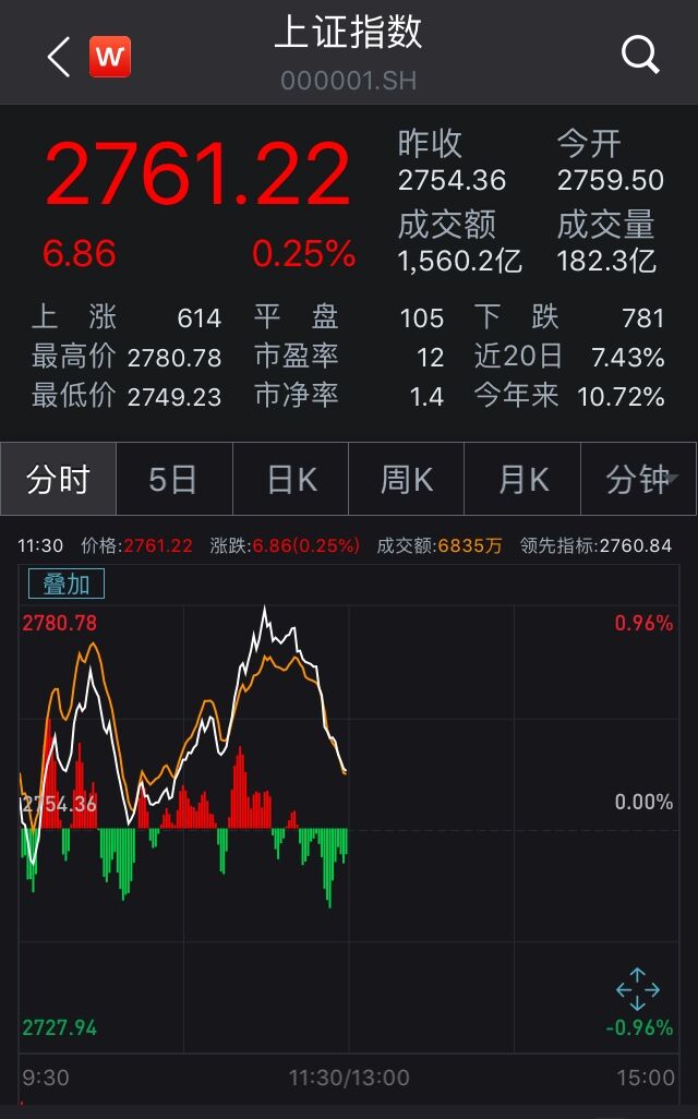 截至午間收盤,滬指報2761.22點,漲0.25%,成交1560億元;深成指報8450.30點,漲0.04%,成交2248億元;創業板指報1410.80點,跌0.20%,成交640億元。