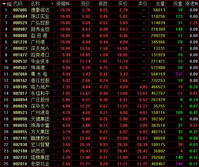 盤面上,受利好消息刺激,粵港澳大灣區概念股掀漲停潮,德豪潤達、珠江實業、鹽田港、廣州港、深天地A、招商港口、香江控股、粵水電等多股漲停,越秀金控、天健集團、方大集團等個股漲幅居前。