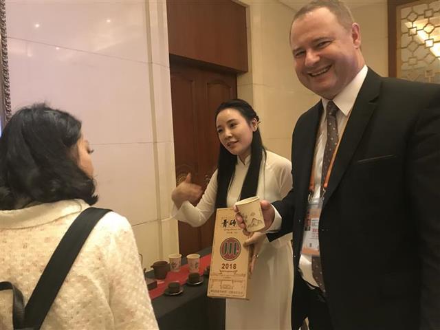 首屆進博會期間,湖北企業(yè)代表與外商代表交談
