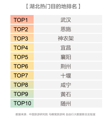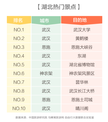 從湖北省內的旅游目的地來看,武漢作為湖北省會,以及中部六省唯一的副省級市,九省通衢,常年全省旅游的領軍地位,是帶動湖北全省、輻射中部地區的旅游動力源和集散樞紐。以黃鶴樓、東湖為代表的著名自然文化旅游資源,和以武漢大學賞櫻為代表的受年輕游客喜愛的潮流玩法,構成武漢旅游資源的突出優勢。