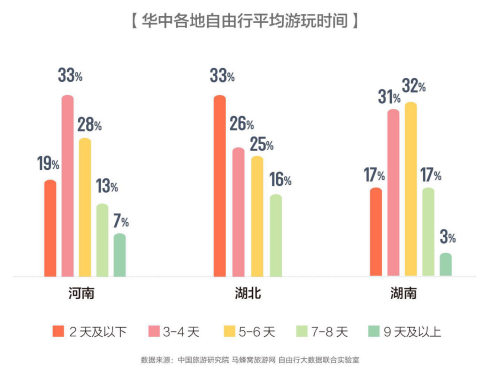 報告還指出,湖北省目前的旅游收入仍有較大的提升空間,大數據顯示,來到湖北的游客平均旅游天數為3.9天,游玩時間在2天及以下的人數占到33%,人均花費為2727元,較周邊的河南、湖南省相對偏低。