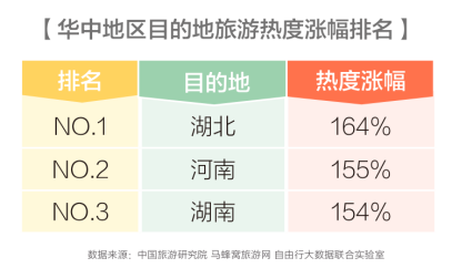 馬蜂窩旅游網和中國旅游研究院共同成立的“自由行大數據聯合實驗室”發布了《毓秀華中:中國省域自由行大數據系列報告之華中地區》。報告顯示,2017年,湖北省以164%的熱度漲幅,位居華中地區第一位。此外,從馬蜂窩平臺上的新增游記數量與新增問答數量來看,湖北省同樣遙遙領先,漲幅分別達到130%和53%。由此可見,湖北旅游的關注度、話題度均有明顯提升。