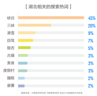 湖北相關的旅游熱搜詞也體現出個性化玩法的巨大市場空間。數據顯示,湖北自然風光獨特,45%的自由行游客會提前搜索“峽谷”的相關信息,其中恩施大峽谷最受歡迎。還有9%的游客關注“滑雪”,神農架國際滑雪場是華中地區第一家大規模采用人工造雪和天然雪相結合的滑雪場,近年來吸引了越來越多熱愛戶外的游客前來。