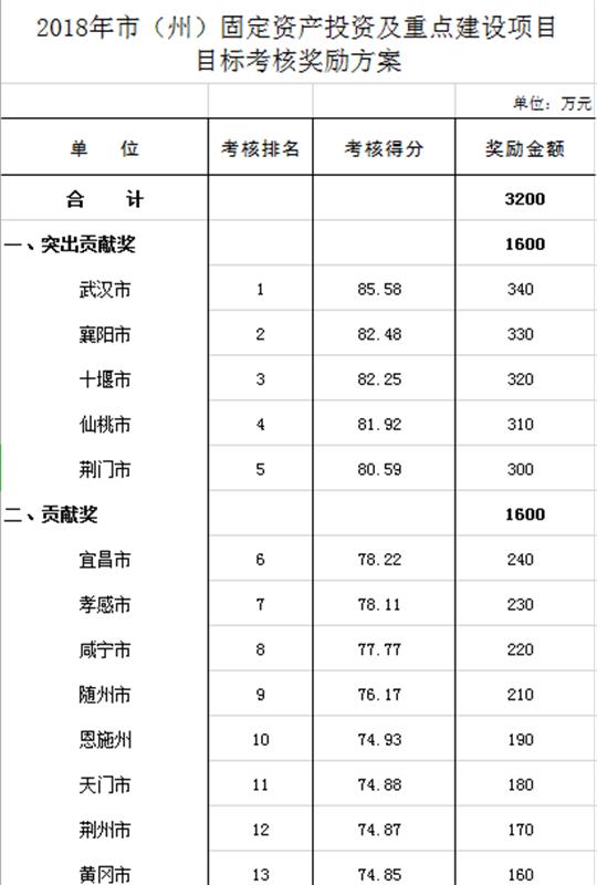 據(jù)透露,這些上上榜地區(qū)將獲得省政府總計(jì)5000萬元的獎(jiǎng)金,其中武漢市等5個(gè)突出貢獻(xiàn)單位按考核排名,分獲340萬元至300萬元不等,宜昌等8個(gè)貢獻(xiàn)單位分獲240萬元至160萬元不等。獲突出貢獻(xiàn)單位的20個(gè)縣市區(qū)各獎(jiǎng)勵(lì)50萬元,獲貢獻(xiàn)單位的20個(gè)縣市區(qū)各獎(jiǎng)40萬元。