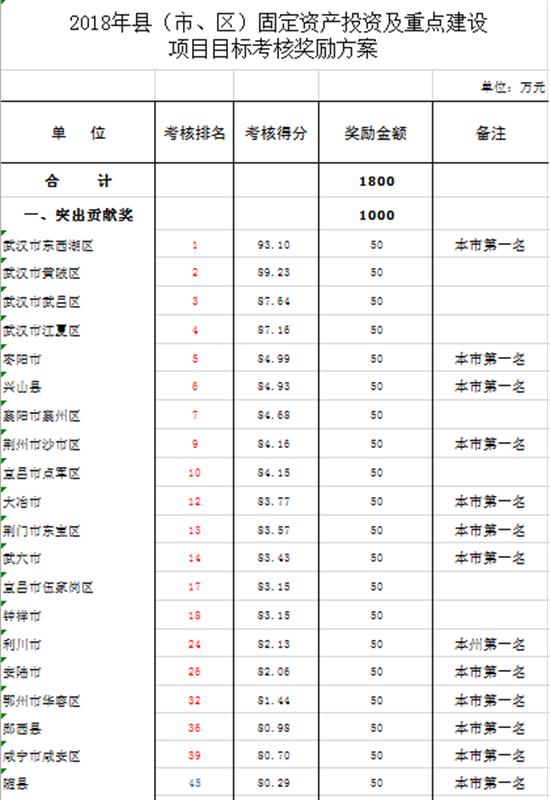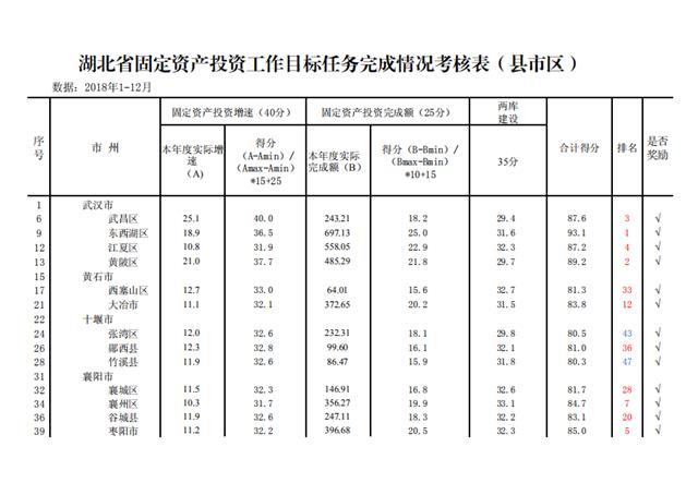 湖北日?qǐng)?bào)訊(記者李劍軍、通訊員趙海濤)2月19日,省政府辦公廳通報(bào)2018年度全省固定資產(chǎn)投資及重點(diǎn)建設(shè)項(xiàng)目目標(biāo)考核情況,武漢市、襄陽市、十堰市、仙桃市、荊門市等5市和武漢市東西湖區(qū)等20個(gè)縣市區(qū)被評(píng)為“全省投資和項(xiàng)目建設(shè)突出貢獻(xiàn)單位”,宜昌市、孝感市、咸寧市、隨州市、恩施州、天門市、荊州市、黃岡市8個(gè)市州和宜昌市夷陵區(qū)等20個(gè)縣市區(qū)獲評(píng)“全省投資和項(xiàng)目建設(shè)貢獻(xiàn)單位”。