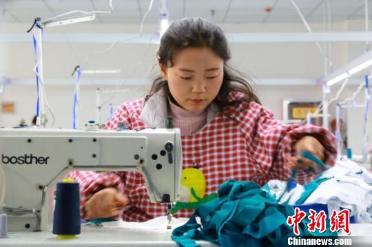 2018年,甘肅武都退出貧困村172個(gè),減少貧困人口2.07萬人,建成“扶貧車間”10家,就業(yè)貧困人口660人。圖為在扶貧車間加工校服的村民。 李董 攝