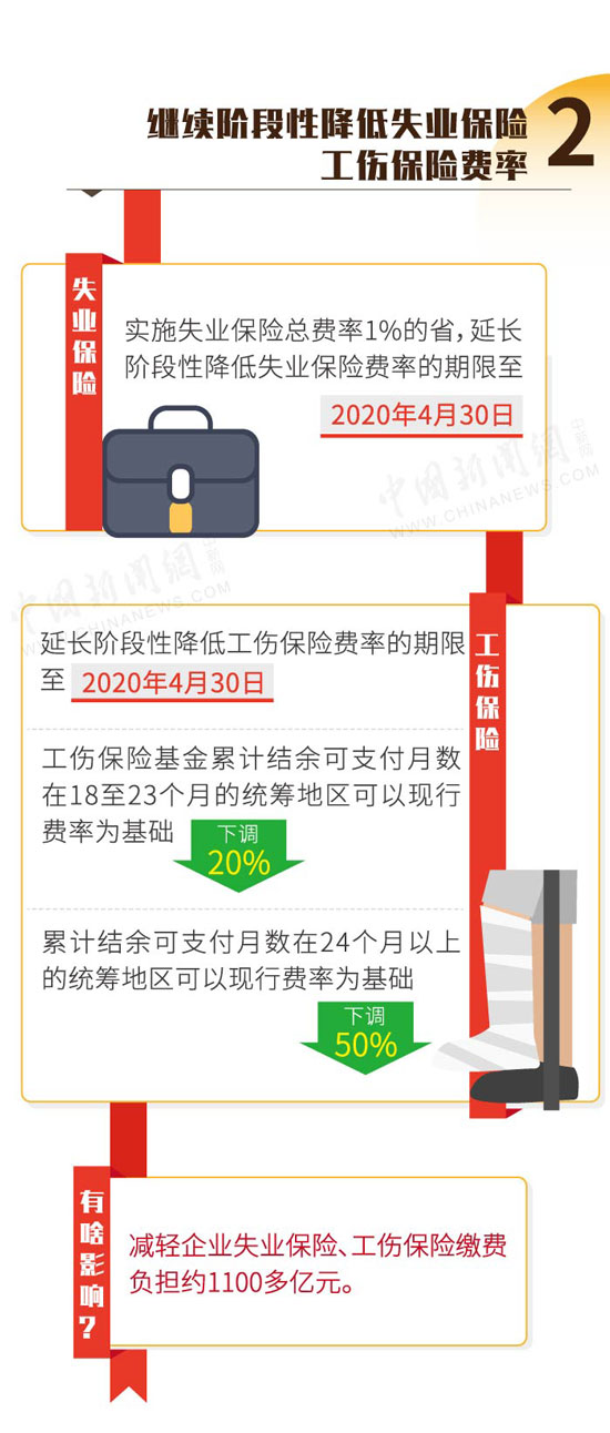 降費率方面,一是降低城鎮職工基本養老保險單位繳費比例,高于16%的省份,可降至16%。二是繼續階段性降低失業保險和工傷保險費率,現行的階段性降費率政策到期后再延長一年至2020年4月30日。