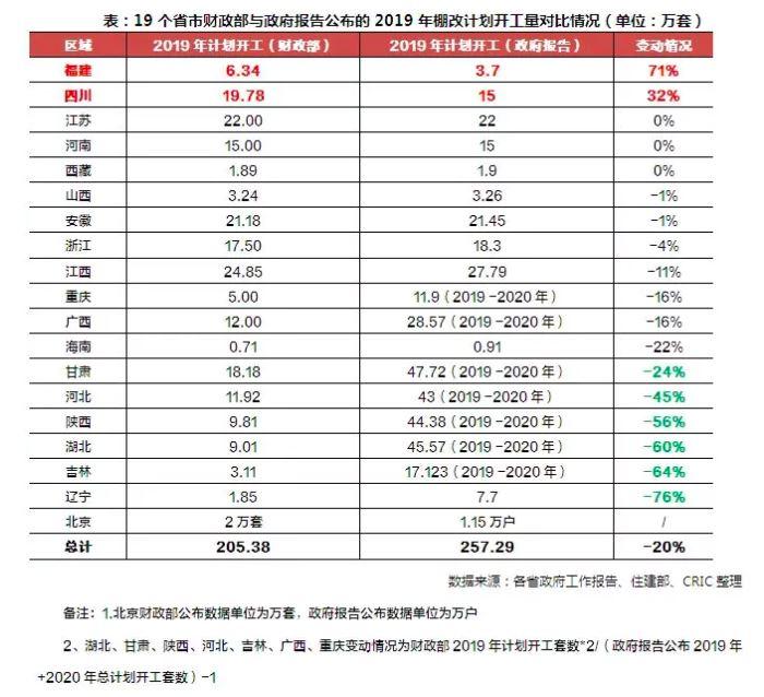 在4月財政部公布各省份2019年棚改計劃開工量之前,2019年1月各地地方政府就曾在2018年工作報告中披露2019年棚改計劃的相關數據,近半數城市的目標較2019年初有了不同程度的下跌。