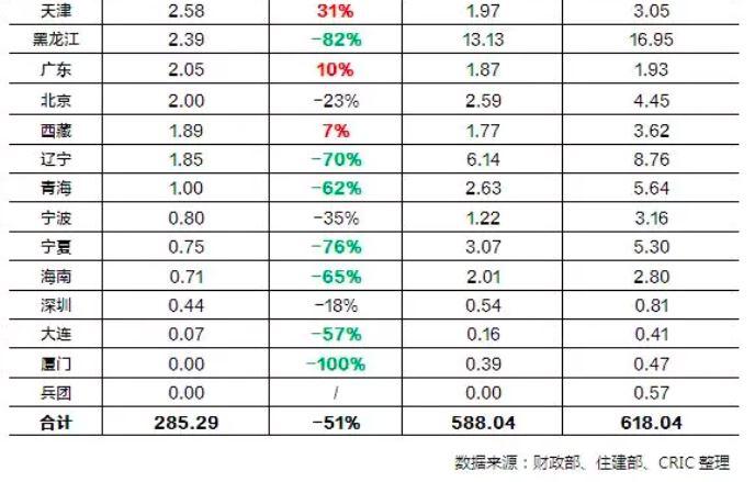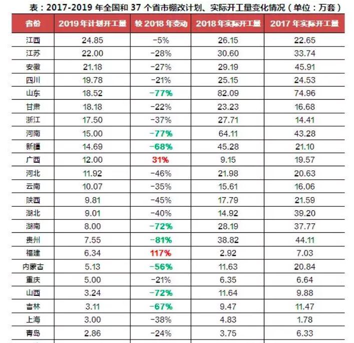 對比2018年,37個省市2019年棚改套數共計285.29萬套,較2018年588萬套的計劃改造套數減少近51%。