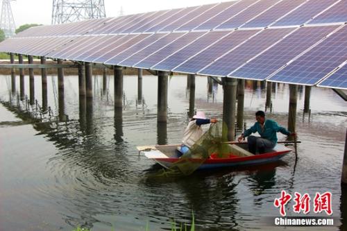 中國(guó)節(jié)能漁光互補(bǔ)項(xiàng)目 農(nóng)戶正在捕撈小龍蝦