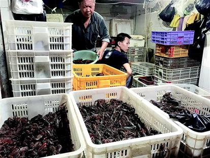 徐女士住在菜場對面的凱樂花園,買的是單只重量9錢以上的小龍蝦,俗稱“炮頭”,每公斤50元。她說5月初“炮頭”每公斤要100元,有時還買不到。