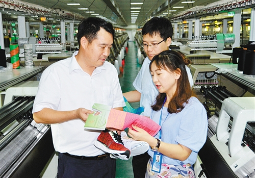 中國銀行荊門分行工作人員在旭福紡織公司的車間了解企業生產情況。(湖北銀保監局供圖)