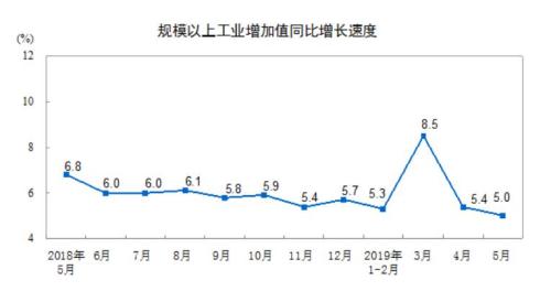 中新網6月14日電 據國家統計局網站消息,2019年5月,規模以上工業增加值同比實際增長5.0%(以下增加值增速均為扣除價格因素的實際增長率),比4月份回落0.4個百分點。從環比看,5月份,規模以上工業增加值比上月增長0.36%。1-5月份,規模以上工業增加值同比增長6.0%。
