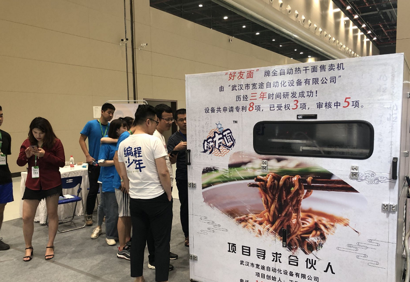 在武漢,你怎能離開熱干面?然而,如果是全自動售賣機做出來的熱干面,你會買單嗎?6月21日至22日,2019東湖創(chuàng)客匯暨武漢創(chuàng)客嘉年華活動在中國光谷科技會展中心舉辦,現(xiàn)場有150家企業(yè)、近千件展品參展。其中,一家熱干面自動化生產(chǎn)設備前排滿了躍躍欲試的觀眾。
