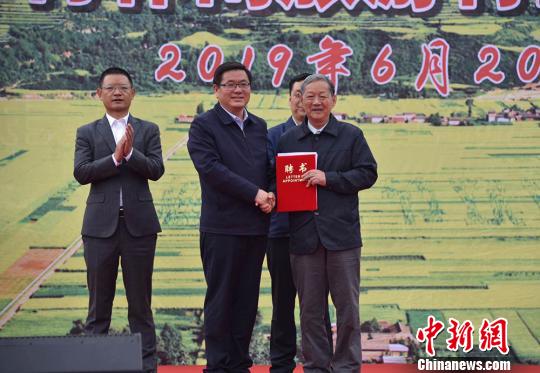 和政縣官方向油菜遺傳育種學家、中國工程院院士傅廷棟(右)頒發“特別顧問”聘書。(資料圖) 鐘欣 攝